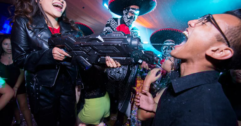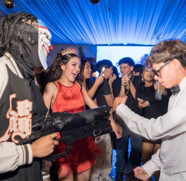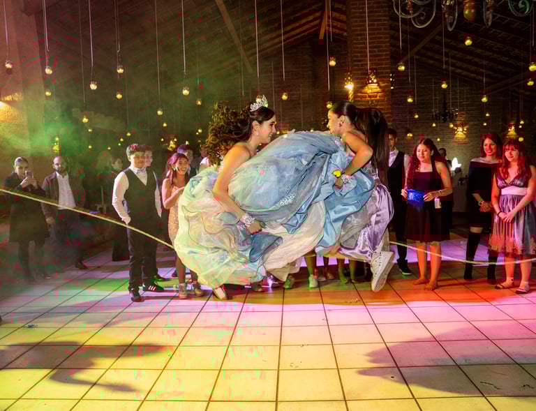 Es el clímax de la noche: radiante, bailando junto a sus amigos y familia, envuelta en luces y música, mientras capturamos cada sonrisa, cada aplauso y esa atmósfera de alegría desbordante que cierra con broche de oro su gran día